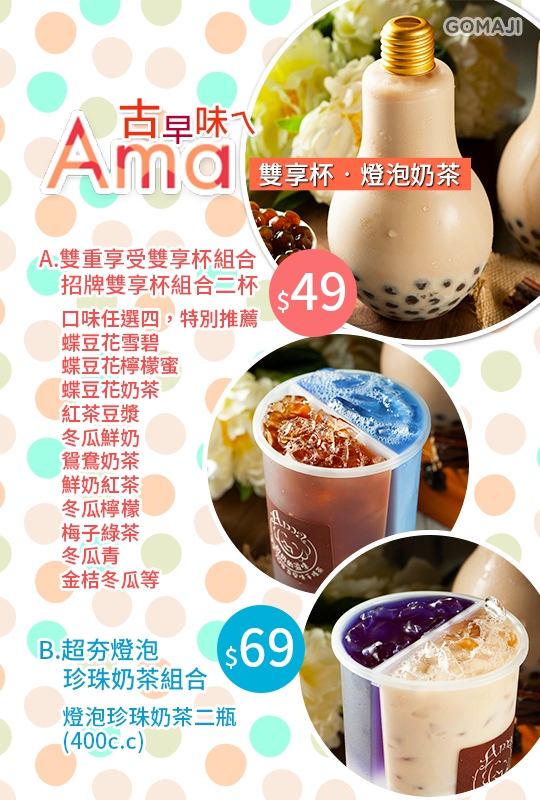 只要49元起,即可享有【古早味ㄟAma 雙享杯?燈泡奶茶】A.雙重享受雙享杯組合 / B.超夯燈泡珍珠奶茶組合