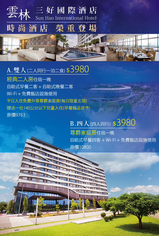 只要3980元起,即可享有【雲林-三好國際酒店】時尚酒店~榮重登場2~4人同價A.雙人/B.四人住宿專案〈A.經典雙人房(二人同行一泊二食) / B.尊爵家庭房(四人同行)住宿一晚 + 自助式早餐 + Wi-Fi + 免費飯店設施使用,A方案另享自助式晚餐二客 + 平日入住免費升等尊爵家庭房(每日限量五間) + 贈送一位140公分以下兒童入住(早餐備品皆含) 〉