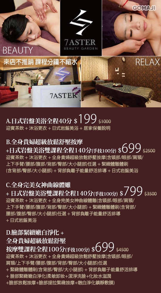7 ASTER Beauty Garden 七星美學院 - 151484是最近關注的一項還算不錯的商品,一樣是在Gomaji上發現的。我真的非常喜歡逛Gomaji,尤其很多東西價格都很不錯,也有不少優惠券可以用,下面是賣場提供的商品簡介: