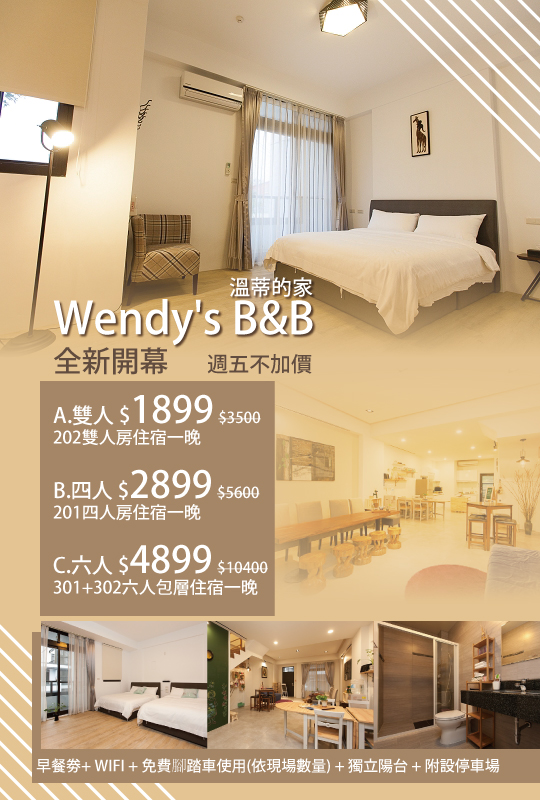只要1899元起,即可享有【宜蘭礁溪-溫蒂的家】全新開幕!週五不加價!礁溪Wendy雙人、四人、六人住宿方案〈含A.(202雙人房)/B.(201四人房)/C.(301+302六人包層)住宿一晚 + 早餐劵 + WIFI + 免費腳踏車使用(依現場數量) + 獨立陽台 + 附設停車場〉